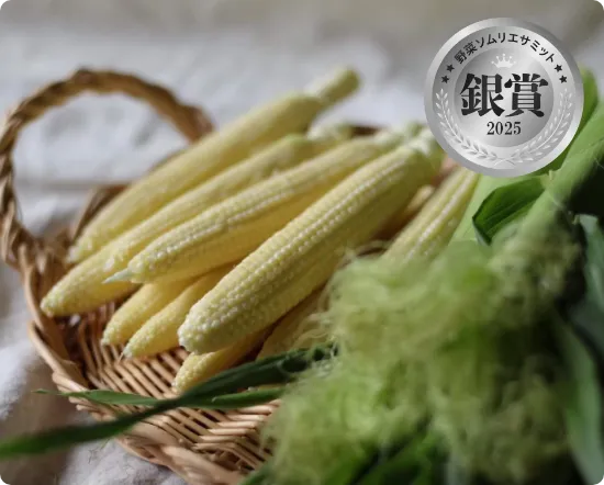 杉中園芸の人気品種「味来(みらい)」のヤングコーンは、2025年の野菜ソムリエサミットで銀賞を受賞した、プロも認める逸品です。通常トウモロコシは1本のみ収穫しますが、こちらは1本目を完熟トウモロコシとして育て、2本目を若採り。この丁寧な手間とこだわりが、他にはない香りとみずみずしさを引き出しています。